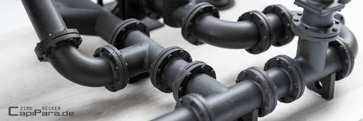 Das Rohrsystem 400 bietet flexibel einsetzbare Rohr-Bauteile mit unendlich vielen Einsatzmöglichkeiten. Die Zahl 400 bezieht sich auf den Außendurchmesser der Rohre, 400 mm im Vorbild entsprechen im Modell-Maßstab 1:32 also 12,5 mm Durchmesser. ALLE Bauteile in diesem System werden mittels Verbindungsmuffen untereinander verklebt. Für Rohrenden gibt es verschiedene Blindmuffen. Ergänzt wird dieses Rohrsystem durch die "Kessel-Bauteilen" und ab April 2024 durch einen kleineren "Bruder", dem Rohrsystem 280.