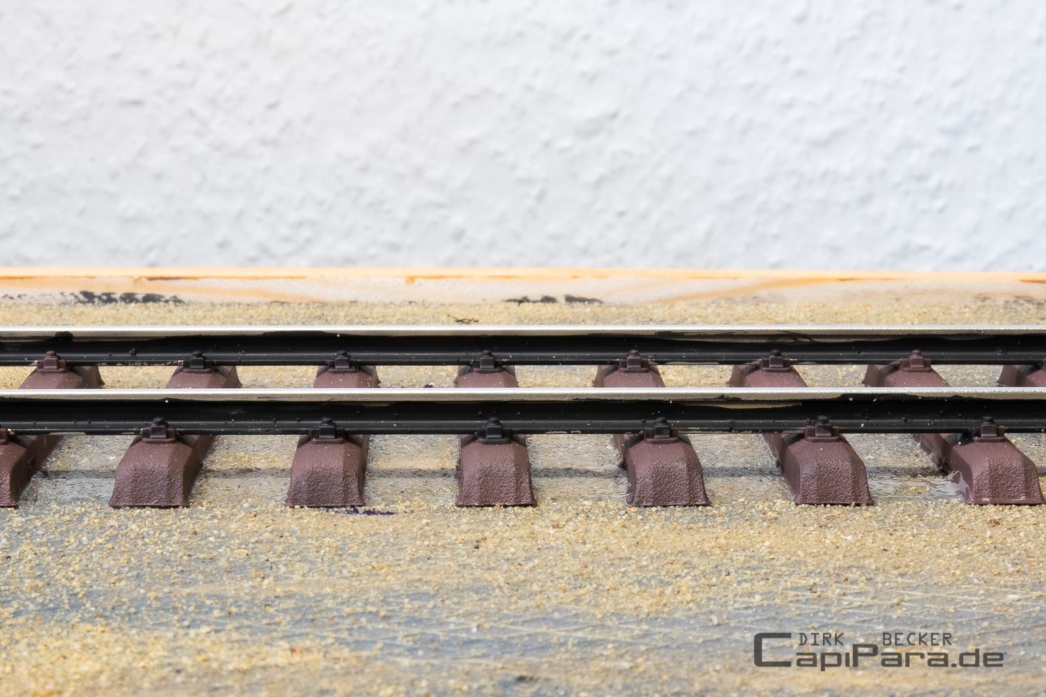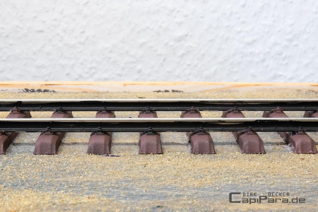 Die Basis für dieses Diorama bildet wieder eine Leimholzplatte in den Abmessungen von 120 x 0,30 cm. Darauf kommt die gestaltete Dioramafläche von 116 x 0,27 cm. Auf dem umlaufenden Rand stützt sich die Acrylglashaube auf.