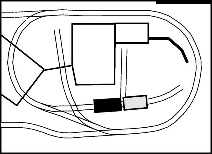 Hier der Gleisplanentwurf für die Gneetzäpplbahn. Kreisverkehr mußte sein, dieser ist sehr hilfreich bei Ausstellungen. Aber auch mit diesen bescheidenen Gleisanlagen sind interessante Rangiermöglichkeiten gegeben. Das schwarze Rechteck verdeutlicht die Größe einer Lok, das graue Rechteck daneben eine Kipplore.