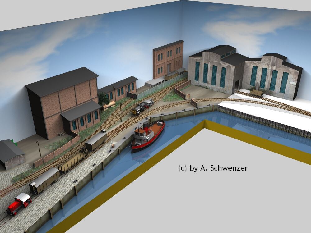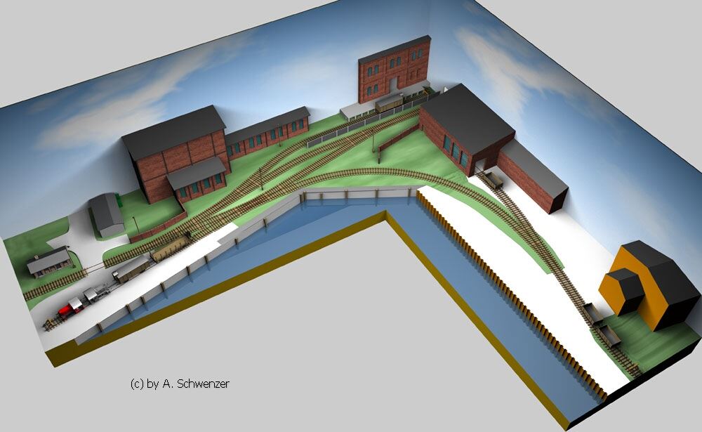 für eine dreidimensionale Zeichnung hatte ich schon recht frühzeitig. Einige Entwürfe waren schon dem gewünschten Aussehen recht nah. Doch so richtig bekommt man erst mit diesen Zeichnungen eine Vorstellung von der Anlage. Bei den Gebäuden sind die Abmessungen nicht zu 100% korrekt, aber der Gesamteindruck ist absolut stimmig. Die Zeichnungen wurde von Andreas Schwenzer aus Halle/Saale erstellt - herzlichen Dank.