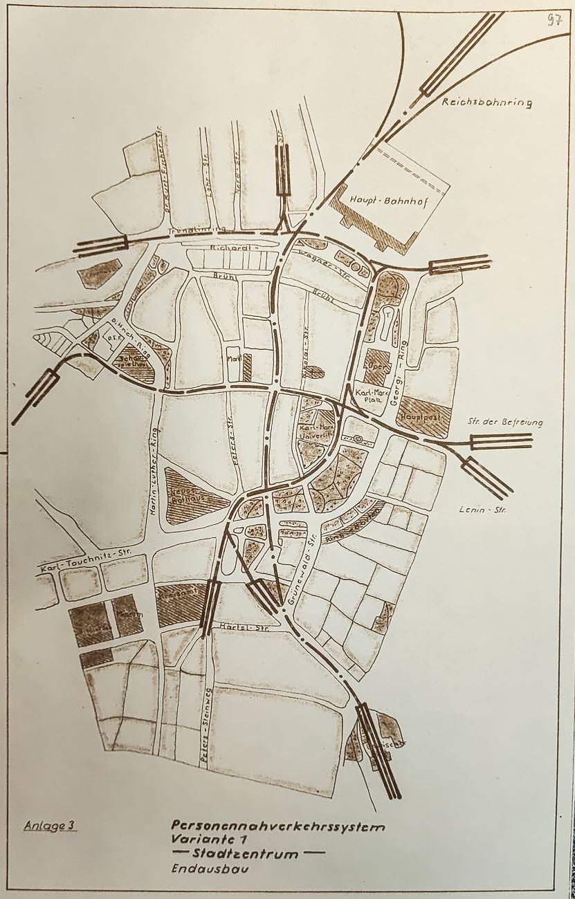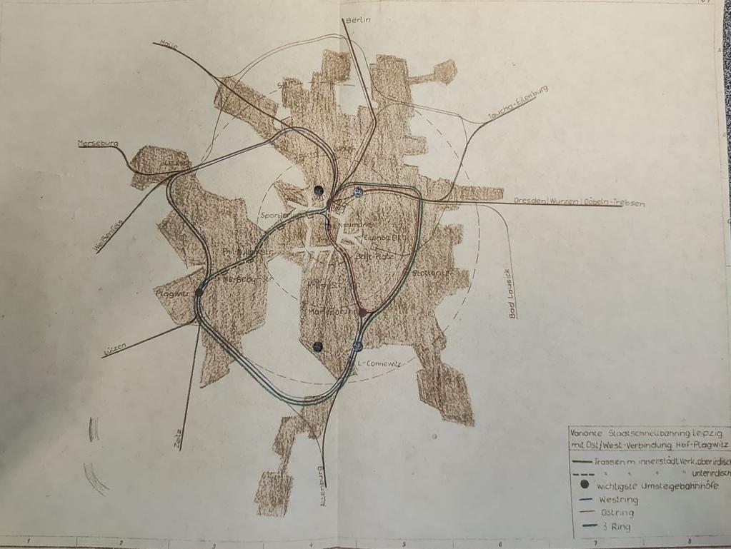 Anfang der 60er Jahre wollte man den Nahverkehr in der Leipziger City grundlegend verbessern. Dafür sollen alle Straßenbahnlinien im Cityring unter der Erde verlaufen und auch ein neuer Nord-Süd-S-Bahntunnel entstehen. Aus heutiger Sicht ein interessantes und ambitioniertes Bauvorhaben. Im Gegensatz zu den vorhandenen Tunnelanfängen (1915) allein aus Richtung Osten (Wurzen) wollte man den Tunnel aus Richtung Norden (Delitzsch), WESTEN (Gohlis) UND Osten (Wurzen) anbinden. Ziel war eine ringförmige S-Bahn um die Messestadt. Es gab einen Ost- und einen Westring, welcher durch einen dritten "Ring" - zwischen dem Bf Plagwitz über das Sportforum zum Hauptbahnhof ergänzt werden sollte. Von all diesen Plänen wurde leider nichts realisiert. Denn dieses Projekt war wohl mit den Mitteln der DDR-Planwirtschaft nicht zu realisieren.